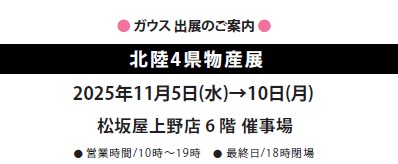展示会 · 2025/10/18 202511上野松坂屋『北陸4県物産展』 新素材チタンの軽さと、 和のエッセンスを取り入れたアクセサリー。 美しいカラーで楽しむ新作も揃えましたので、 ぜひご覧ください。 ガウスデザイナー町田義信が来場し、 6階催事場でお待ちしております。 HOME tagPlaceholderカテゴリ: